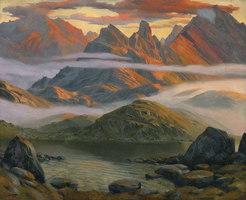 Me siento atraído por el movimiento como la expresión de la fuerza de la vida.Los remolinos de niebla y la nube o una bailarina volando por el aire parecen ser excelentes expresiones de esta fuerza.Mis pinturas pretenden combinar el paisaje y los bailarines en una síntesis más cohesiva Del movimiento y la emoción.Las figuras de los movimientos y las emociones armonizan con el movimiento y las emociones del paisaje.La figura y el paisaje será como uno, ambos se complementan mutuamente.